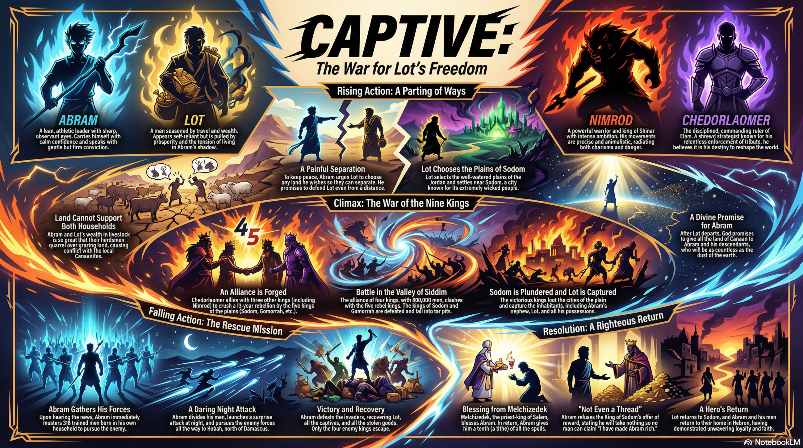 The narrative takes a dramatic turn as Lot, enticed by the lush plains of Jordan, departs toward the ominous city of Sodom, leaving Abram in Canaan to embrace God’s renewed promise of an abundant legacy. Meanwhile, chaos erupts with Chedorlaomer, king of Elam, amassing a formidable army of 800,000 to obliterate Sodom and Gomorrah. As the valley of Siddim becomes a battlefield of nine kings, Lot is captured, triggering a daring nocturnal rescue led by Abram and his 318 warriors. Abram’s surprise attack shatters the enemy, reclaiming Lot and the stolen riches in a triumphant victory.