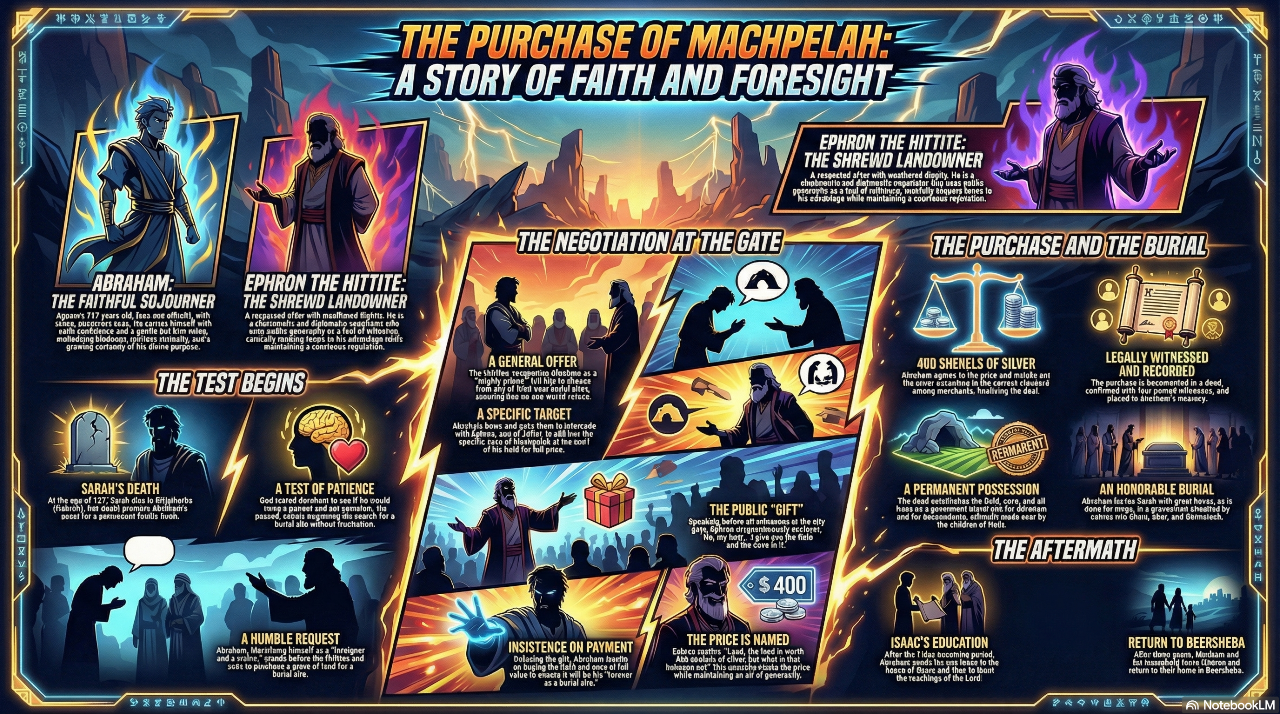 Amid the conflict, a dramatic covenant is forged between Abraham and Abimelech, solidified by the symbolic exchange of sheep and 7 ewe lambs. Peace is restored in Beersheba, where Abraham plants a lush grove with four gates welcoming travelers from all directions. His home becomes a sanctuary of generosity, offering sustenance and comfort to all who pass by, as Abraham dedicates his life to spreading knowledge of the Lord. Meanwhile, Abraham’s descendants and distant relatives like Lot’s and Ishmael’s offspring multiply and flourish, carving their own legacies in the land, while the echoes of Terah’s passing signal the close of an era.