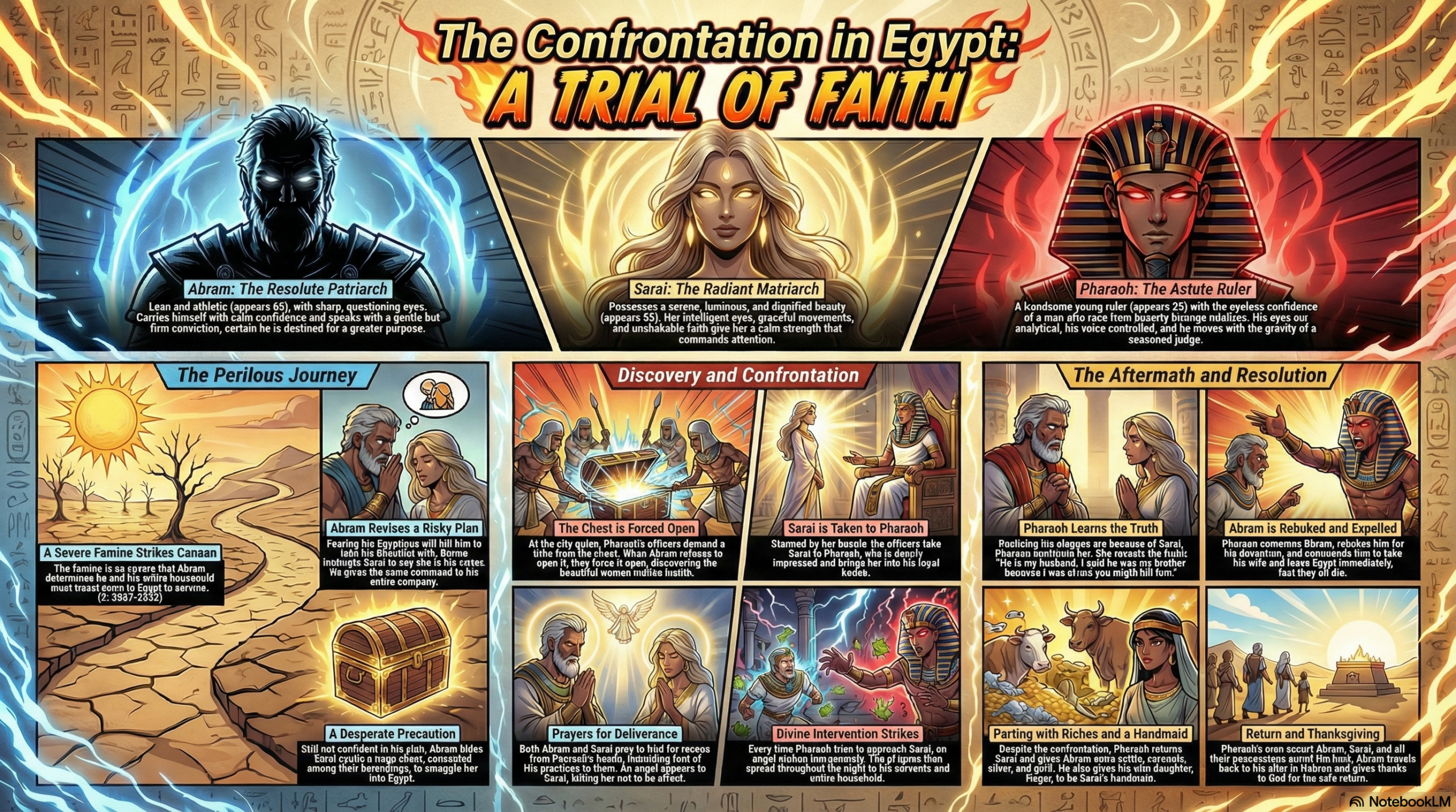 The narrative swells with tension as a devastating famine ravages Canaan, sending its inhabitants fleeing toward the uncertain refuge of Egypt. Abram, with his family and followers in tow, pauses by the brook Mitzraim, savoring a brief respite from their arduous trek. As they settle in Egypt, shadows of unforeseen trials cast a pall over their existence, culminating in the heart-wrenching separation of Abram from his beloved wife Sarai. This ominous twist propels them into a drama brimming with peril and divine intervention, as Abram’s desperate prayers summon an angelic presence to protect Sarai, smiting Pharaoh’s household and transforming their fortunes.