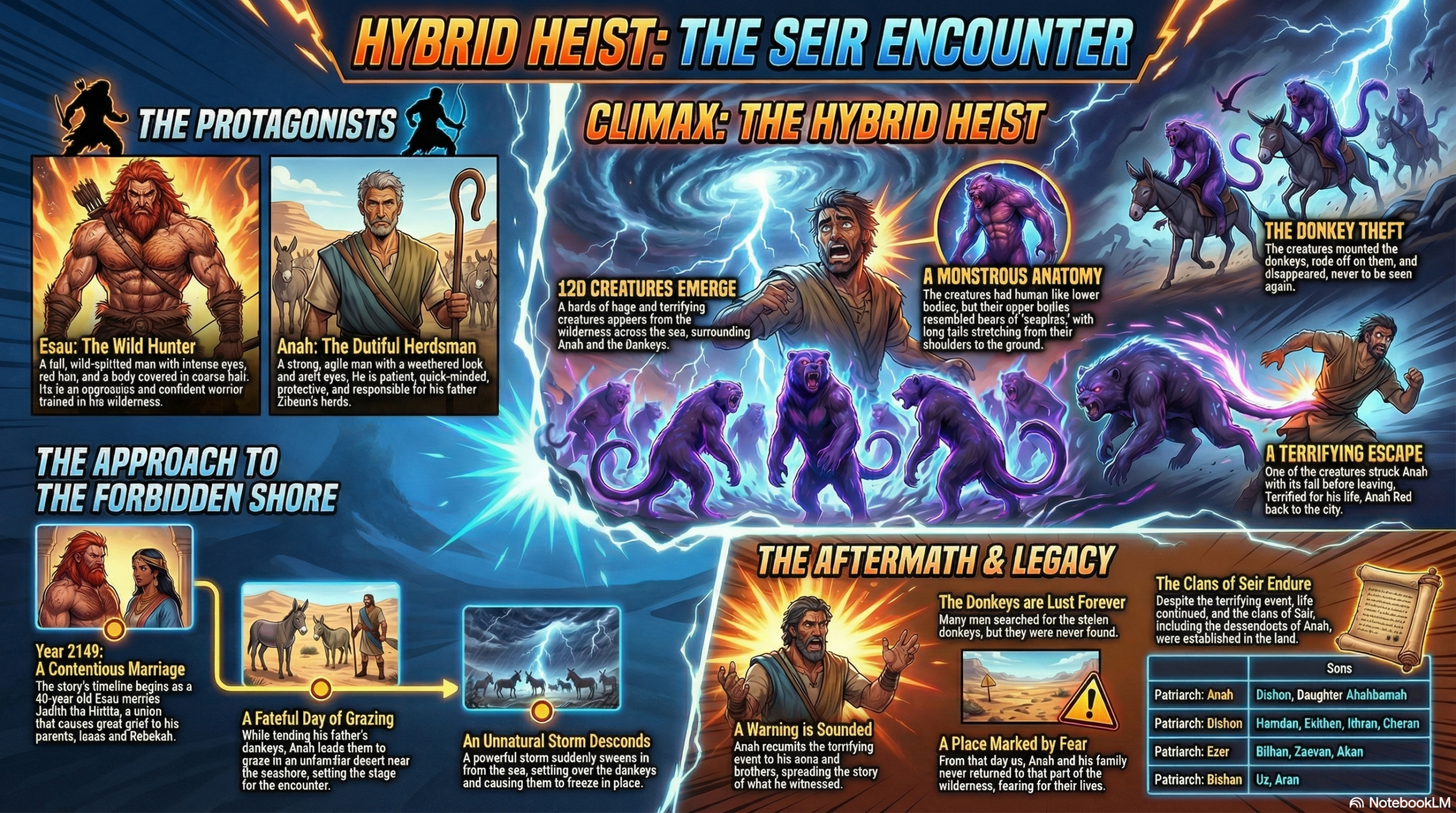 In a land fraught with tension, Esau takes a Hittite wife, Judith, a decision that brings heartache to his parents, Isaac and Rebekah. The wilderness reveals its own mysteries when Anah, while tending his father’s donkeys, encounters a terrifying storm and grotesque creatures—part human, part beast—who steal the donkeys and vanish into the unknown. Stricken with fear, Anah recounts his harrowing tale, and from that day, neither he nor his family dare return to the haunted wilderness.