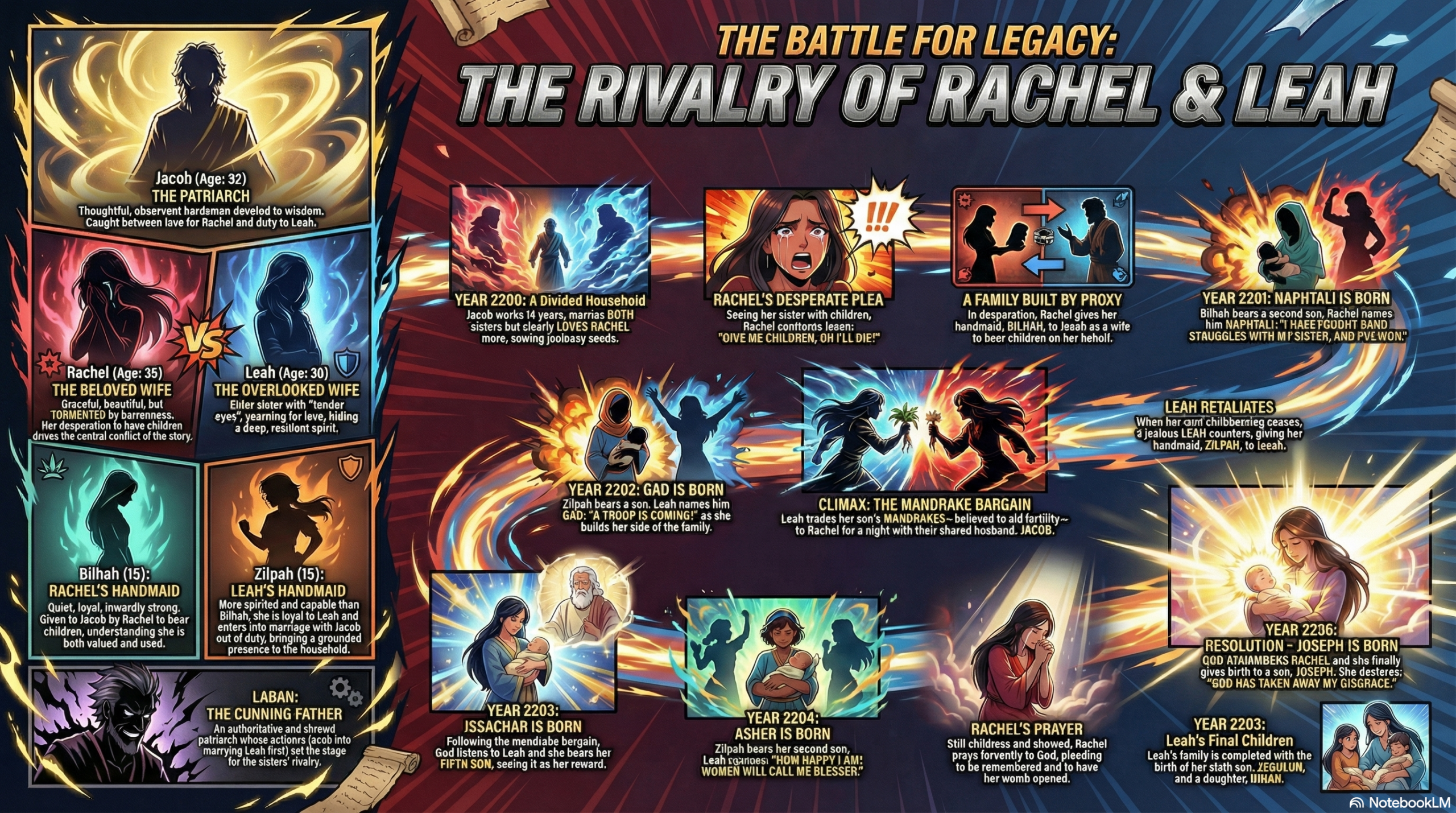 In a whirlwind of passion, envy, and divine intervention, Jacob’s household is embroiled in a fierce rivalry between Rachel and Leah as they vie for his love and the blessing of children. Rachel, devastated by her barrenness, offers her handmaid Bilhah to Jacob, igniting a cascade of births that further intensifies the tension. Leah, not to be outdone, counters by giving her maid Zilpah to Jacob, sparking a dramatic battle of wills between the sisters. As the struggle for children continues, mandrakes are exchanged for nights with Jacob, and prayers to God bring forth sons, culminating in the long-awaited birth of Joseph, Rachel’s cherished son.