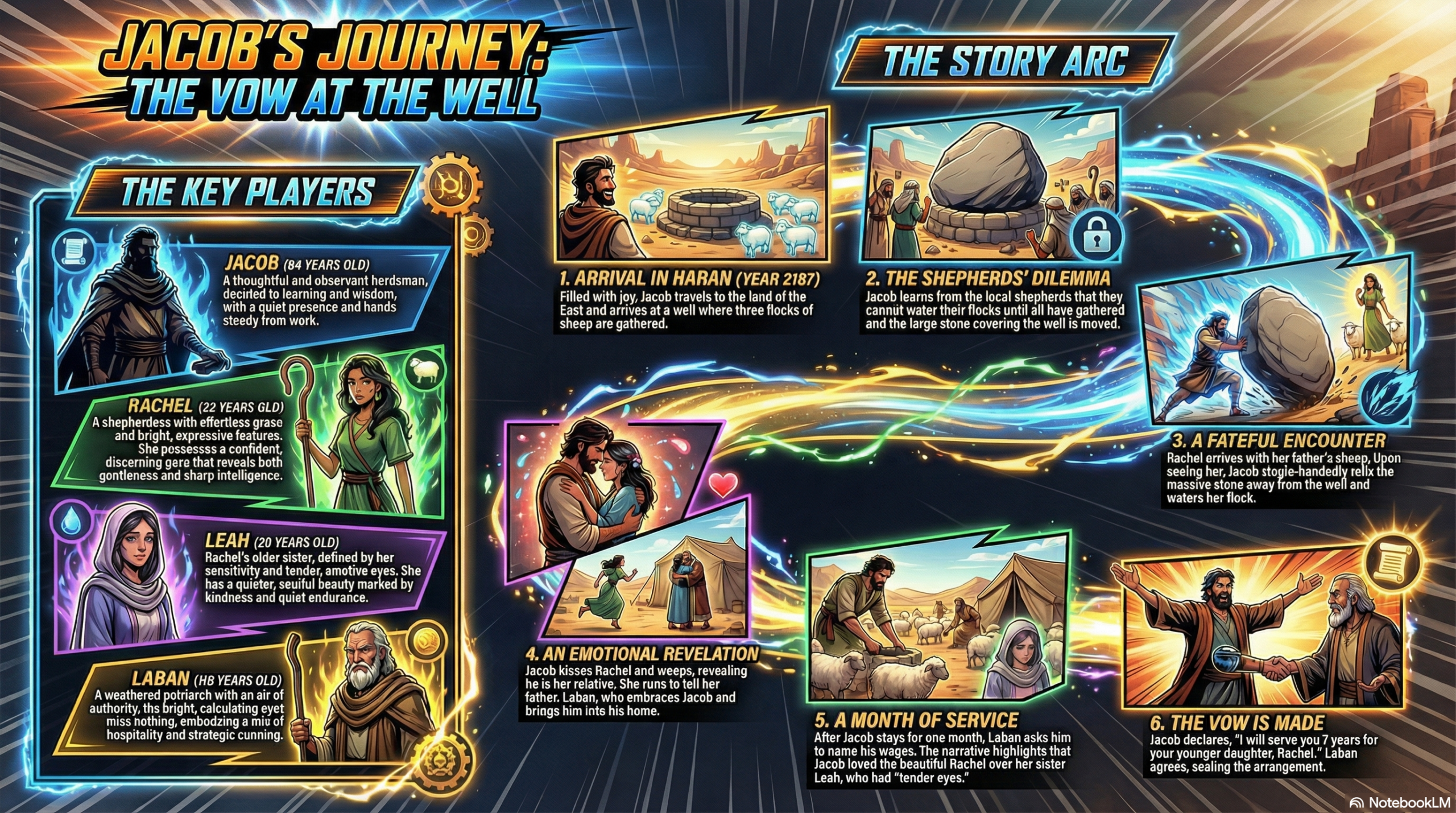 Jacob, filled with joy, sets out on a journey to Haran, where he encounters shepherds and a mysterious well guarded by a heavy stone. Upon learning that Rachel, the daughter of Laban, is approaching with her flock, Jacob’s heart stirs. With a surge of strength and emotion, he rolls the stone away and waters her sheep. Overcome by love, Jacob kisses Rachel, weeping as he reveals his identity and his troubled past. Welcomed into Laban’s household, he offers seven years of service in exchange for Rachel’s hand, while the weight of family loss casts a shadow over his newfound hope.