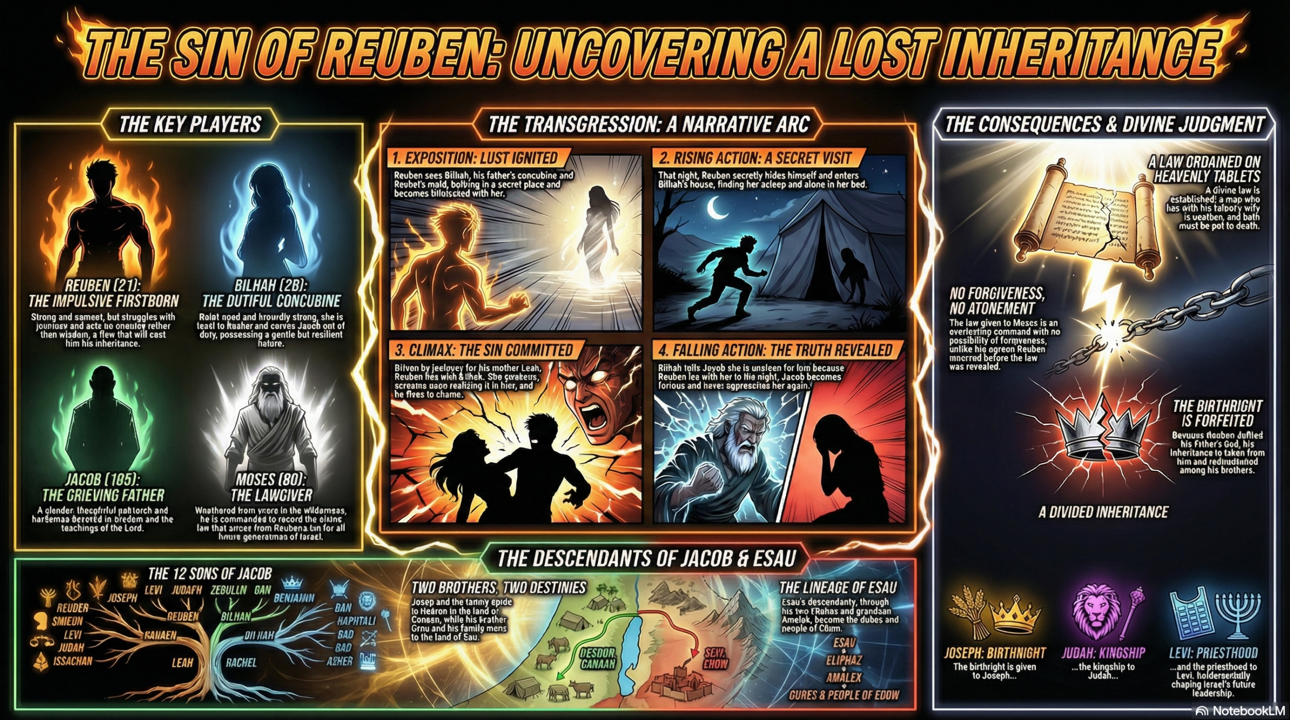 In a storm of forbidden desire and betrayal, Reuben, driven by jealousy for his mother Leah, succumbs to temptation and secretly lies with Bilhah, his father’s concubine. Bilhah awakes in horror, discovering her violator is none other than Reuben, her shame sealed in silence. Jacob, upon learning of his son’s grievous sin, is consumed with rage, casting Reuben into disgrace and severing ties with Bilhah forever. This act of profound defilement shakes the moral order, prompting divine wrath and eternal decrees of death for those who dare commit such an unholy transgression.