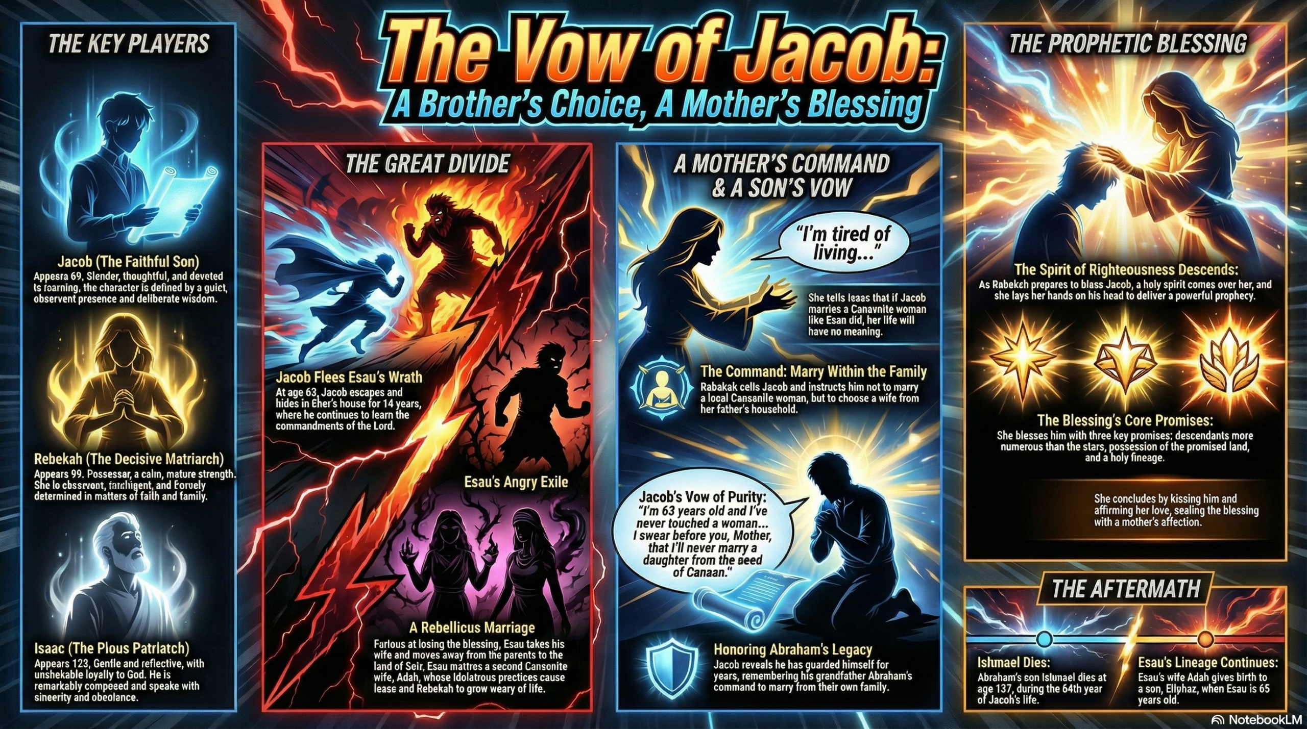 Jacob, fearing his brother Esau’s wrath, flees to the house of Eber and hides for 14 years, devoting himself to learning the ways of the Lord. Meanwhile, Esau, enraged over losing his blessing, abandons his parents, marries a Hittite woman, and returns to vex his family with his pagan ways. Rebecca, heartbroken by Esau’s choices, warns Jacob to avoid the daughters of Canaan and seeks a righteous lineage through him. Jacob pledges to honor his mother’s wishes, and Rebecca, filled with divine inspiration, blesses Jacob with a prophetic vision of his future descendants, who will multiply and inherit the promised land. Amid these family struggles, the death of Ishmael brings a somber moment of reflection for Isaac, as new generations continue to be born, furthering the complex saga of their lineage.