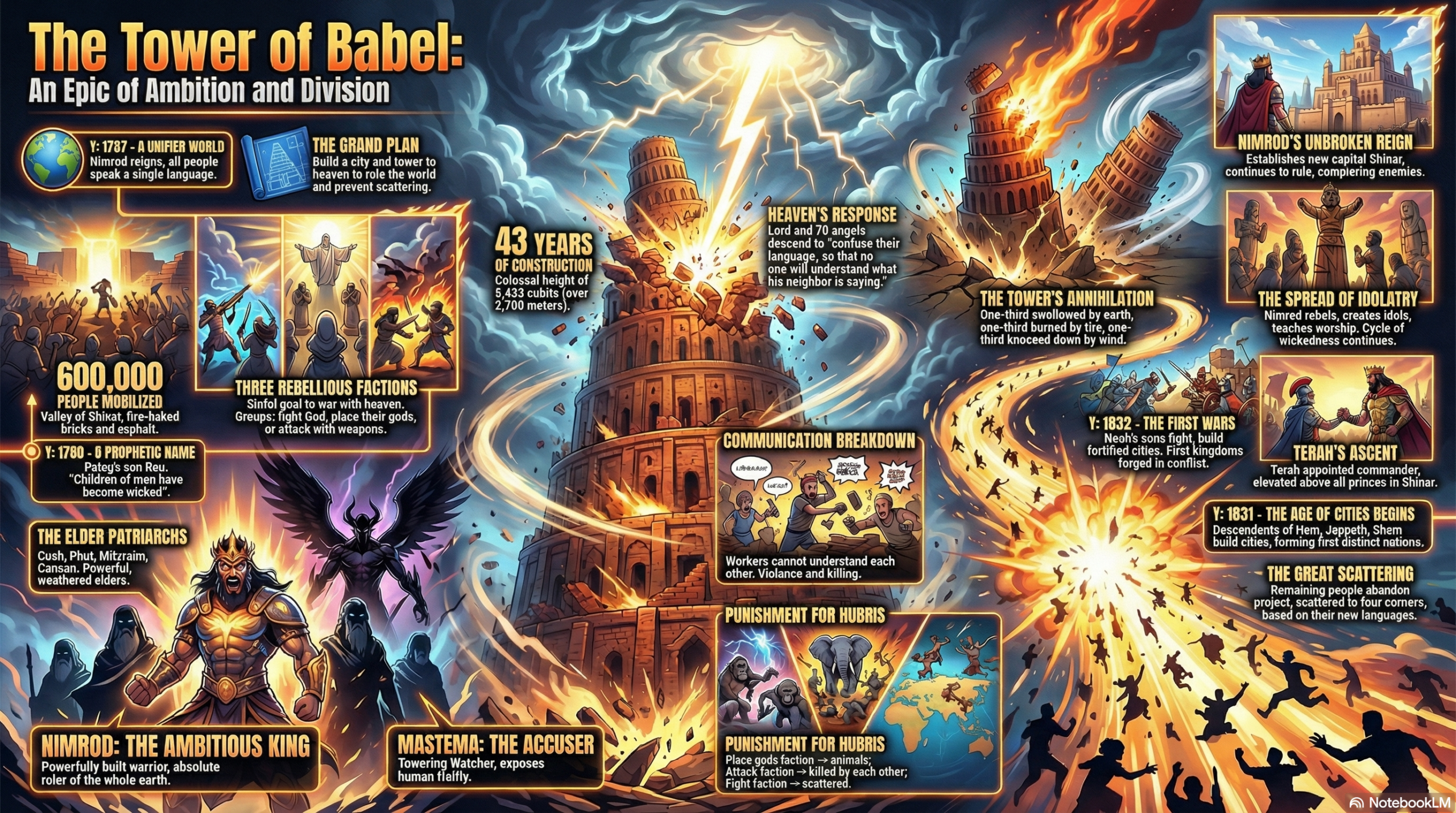 In an age of monumental ambition and divine intervention, the people of Shinar, united by a single language, embarked on an audacious endeavor to build a tower reaching the heavens. For forty-three years, they toiled, their unity and pride growing with each ascending brick. But the Lord, descending with seventy angels, saw their hubris and confounded their language, turning harmony into chaos. Confusion reigned as workers, unable to understand one another, descended into violence and discord. The great tower of Babel crumbled, its fall a dramatic testament to mankind’s overreaching ambition, scattering the people across the earth and forever dividing them by language and strife.