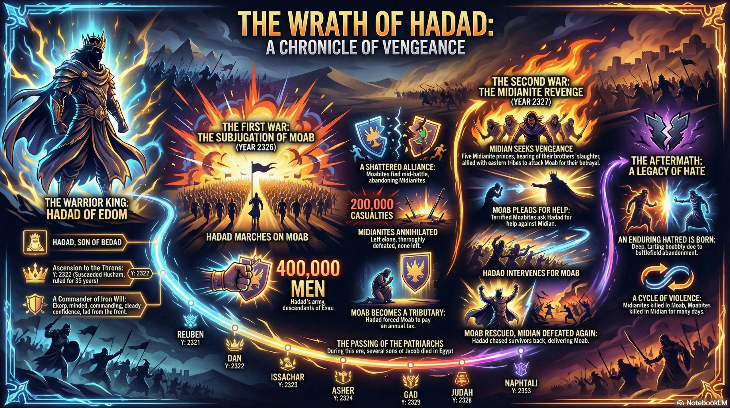 In a series of powerful and dramatic events, the sons of Jacob, Reuben, Dan, Issachar, Asher, and Gad, each meet their end in Egypt, one by one, leaving a legacy of family strength in the land of their captivity. Meanwhile, Hadad, the formidable king of Edom, rises in might, waging a brutal war to subjugate Moab, crushing an alliance with Midian that falls in bloody defeat. Driven to avenge the loss, Midian rallies the eastern tribes against Moab, only to face Hadad’s fierce retaliation once more, as he decisively crushes the rebellion, securing Moab under Edom’s control and igniting a bitter feud between Midian and Moab. Amid this clash of kingdoms and the passing of Israelite patriarchs, Judah and Naphtali also succumb to their years, marking the end of an era as the sons of Jacob fade from the earth, leaving Egypt rife with memories of both peace and strife.